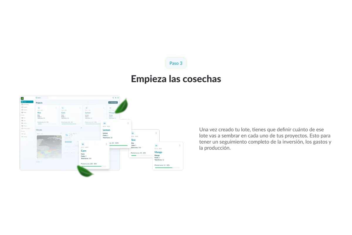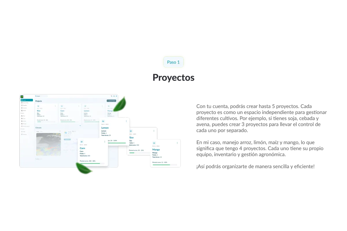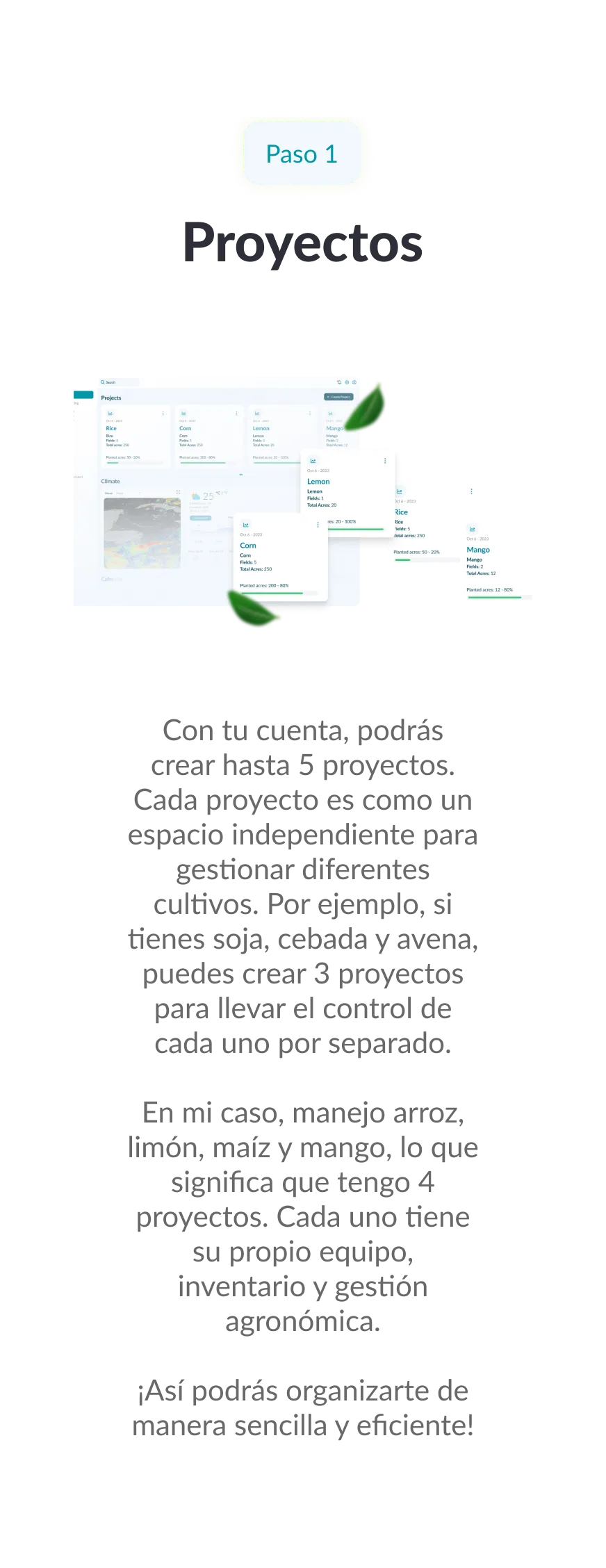Crear proyectos personalizados según el cultivo (arroz, maíz, café, etc.)