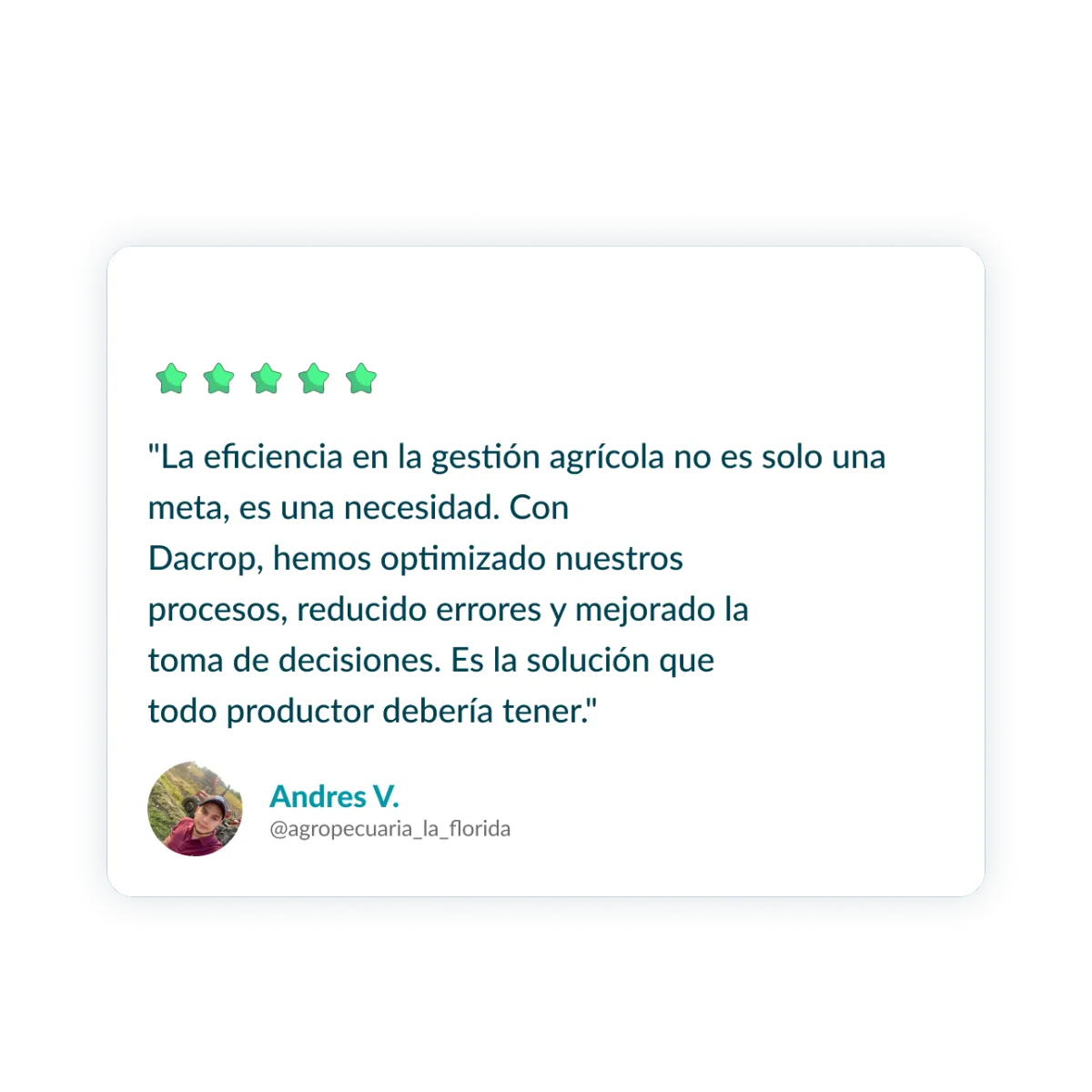 Dacrop te ayuda a planear mejor, evitar desperdicios y controlar el uso de insumos, mano de obra y tareas, sin depender de hojas sueltas ni memoria. Más eficiencia, menos pérdidas.